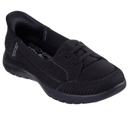 Step into stylish comfort with Skechers Hands Free Slip-ins®: On-the-GO® Flex - Top Notch. With our exclusive Heel Pillow™ designed to keep your foot securely in place, this laceless style features a woven fabric and mesh upper with a Skechers Air-Cooled Memory Foam® comfort insole and a lightweight ULTRA GO® cushioned midsole.